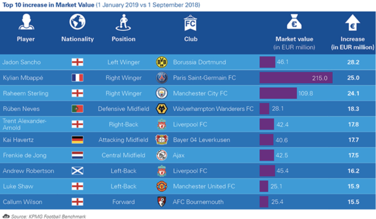 Football Benchmark က ထုတ်ပြန်မှုမှာတော့ “ ထိပ်ဆုံး 3 ဦးက တိုက်စစ်သမားတွေဖြစ်ပေမယ့် မူလတန်ကြေးထက် တိုးမြင့်မှုအရှိဆုံး ကစားသမားများစာရင်းမှာ ကွင်းလယ်လူ 3 ဦး၊ ခံစစ်သမား 3 ဦးပါလာခဲ့တယ်။ အများဆုံးအဖြစ် ပရီးမီးယားလိဂ်မှ 6 ဦး ပါဝင်လာပြီး ဘွန်ဒက်လီဂါမှ 2 ဦး၊ ပြင်သစ်လီဂူးမှ 1 ဦးနဲ့ နယ်သာလန်လိဂ်မှ 1 ဦးတို့ ပါဝင်ပါတယ် ” အဆိုပါ စစ်တမ်းက ဖော်ပြပါတယ်။