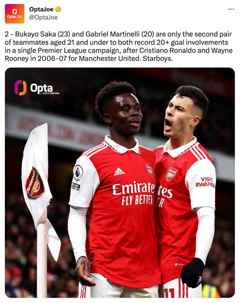 ဆောက်သမ်တန်ကို ၃-၃ သရေကျတဲ့ပွဲမှာ သွင်းဂိုးတွေရခဲ့ကြတဲ့ မာတင်နယ်လီနဲ့ ဆာကာတို့ဟာ ပရီးမီးယားလိဂ် အကျော်အမော်တွေဖြစ်တဲ့ ရော်နယ်ဒိုနဲ့ ရွန်းနီတို့ရဲ့ စံချိန်ကောင်းကို လိုက်မှီခဲ့ကြပါပြီ။